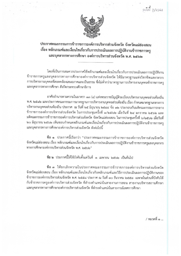 หลักเกณฑ์และเงื่อนไขเกี่ยวกับการประเมินผลการปฏิบัติงานข้าราชการครูและบุคลากรทางการศึกษา องค์การบริหารส่วนจังหวัด พ.ศ. 2562