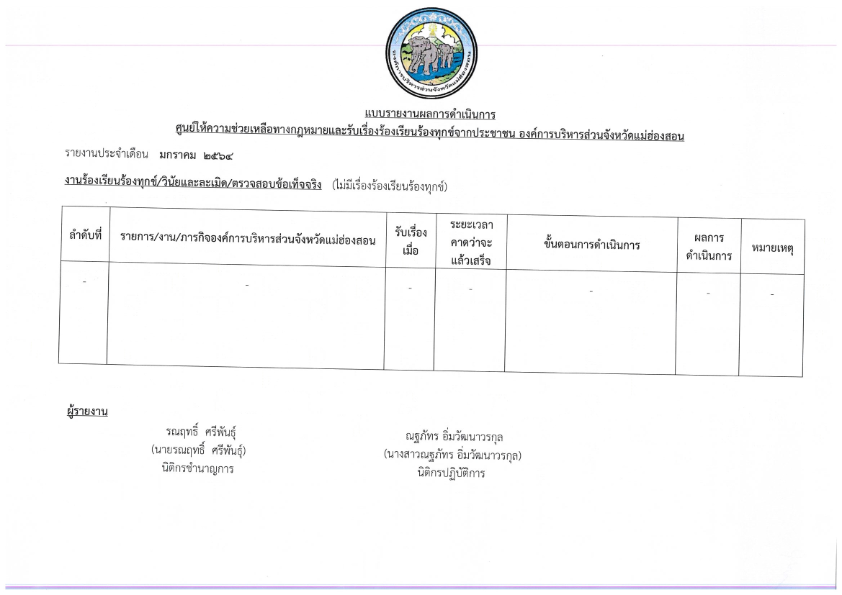 รายงานผลการดำเนินการรับเรื่องราวร้องเรียนร้องทุกข์ฯ ประจำเดือนมกราคม 2564