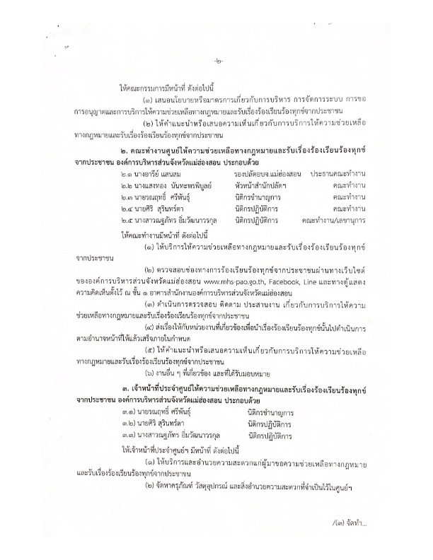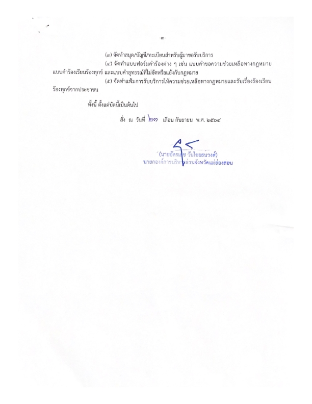 คำสั่งแต่งตั้งคณะกรรมการอำนวยการ คณะทำงาน และเจ้าหน้าที่ประจำศูนย์ให้ความช่วยเหลือทางกฎหมายและรับเรื่องร้องเรียนร้องทุกข์จากประชาชน องค์การบริหารส่วนจังหวัดแม่ฮ่องสอน (ฉบับแก้ไข ปี 2564)