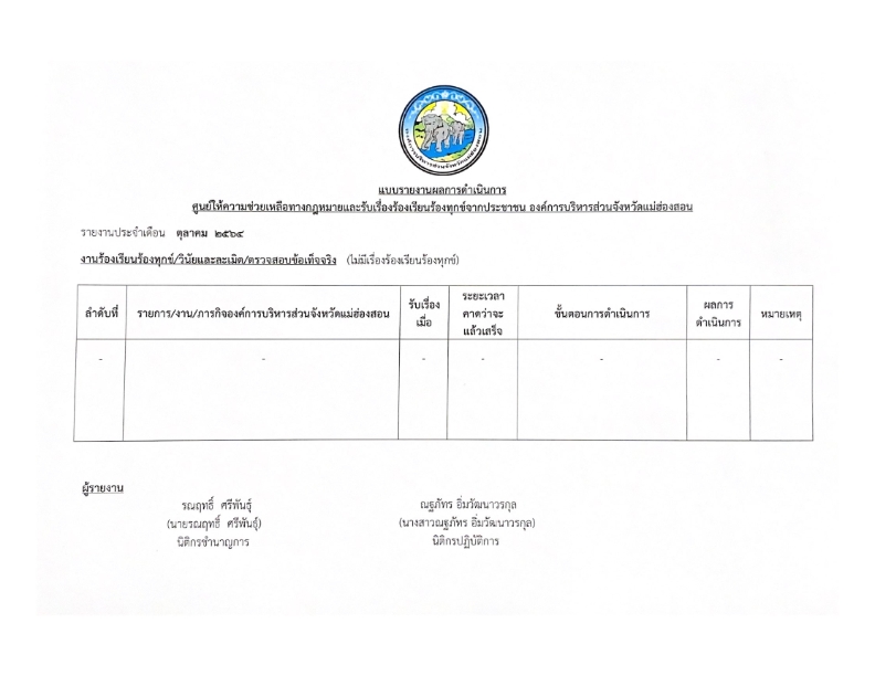 รายงานผลการดำเนินการรับเรื่องราวร้องเรียนร้องทุกข์ฯ ประจำเดือนตุลาคม 2564