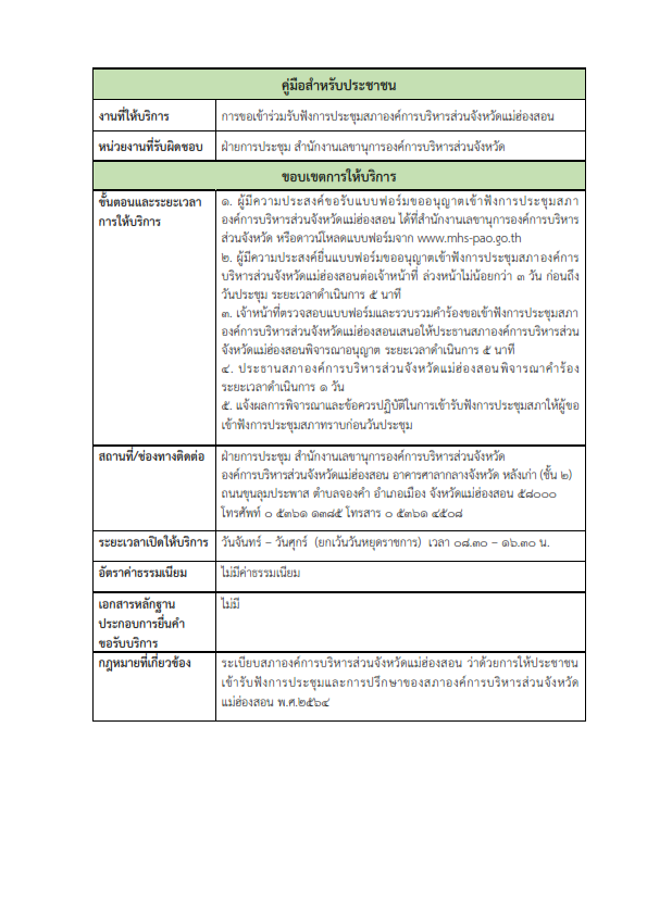 คู่มือสำหรับประชาชน การขอเข้าร่วมรับฟังการประชุมสภาองค์การบริหารส่วนจังหวัดแม่ฮ่องสอน (ฉบับปรับปรุง พ.ศ. 2565)