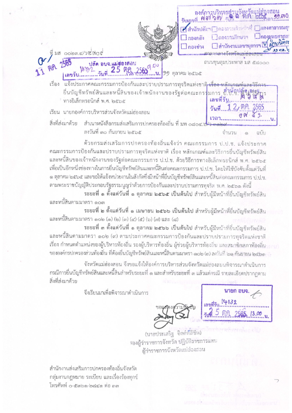 แจ้งประกาศคณะกรรมการป้องกันและปราบปรามการทุจริตแห่งชาติ เรื่อง หลักเกณฑ์และวิธีการยื่นบัญชีทรัพย์สินและหนี้สินของเจ้าพนักงานของรัฐต่อคณะกรรมการ ป.ป.ช. ด้วยวิธีการทางอิเล็กทรอนิกส์ พ.ศ. 2565