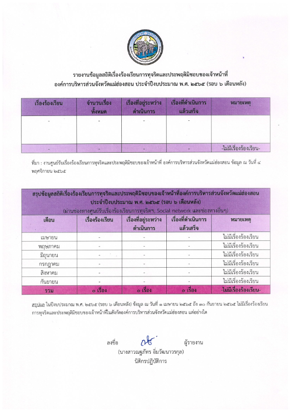 รายงานข้อมูลสถิติเรื่องร้องเรียนการทุจริตและประพฤติมิชอบของเจ้าหน้าที่องค์การบริหารส่วนจังหวัดแม่ฮ่องสอน ประจำปีงบประมาณ พ.ศ. 2565 (6 เดือนหลัง)