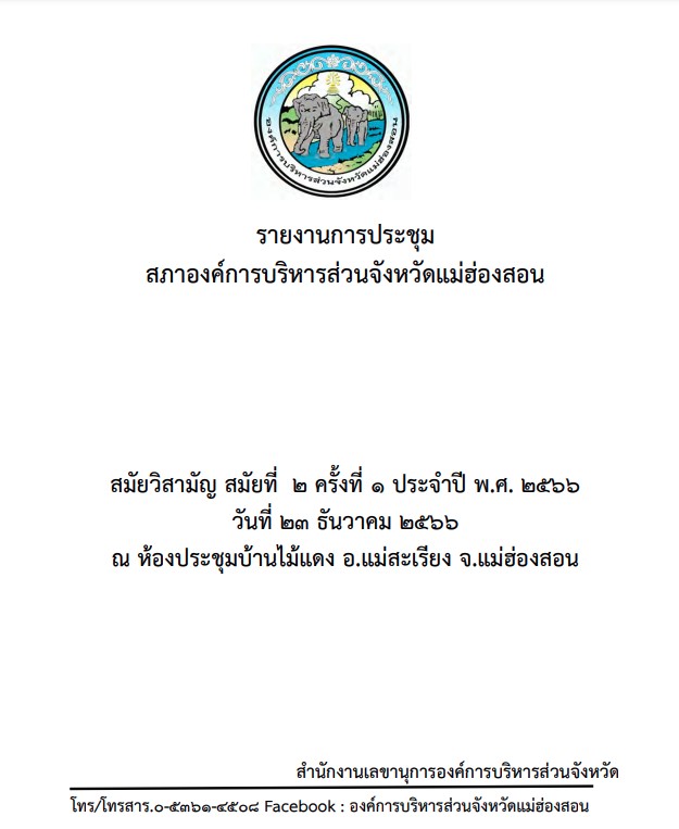 รายงานการประชุม สภาองค์การบริหารส่วนจังหวัดแม่ฮ่องสอน สมัยวิสามัญ สมัยที่ 2 ครั้งที่ 1 ประจำปี พ.ศ. 2566 วันที่ 23 ธันวาคม 2566 ณ ห้องประชุมบ้านไม้แดง อ.แม่สะเรียง จ.แม่ฮ่องสอน