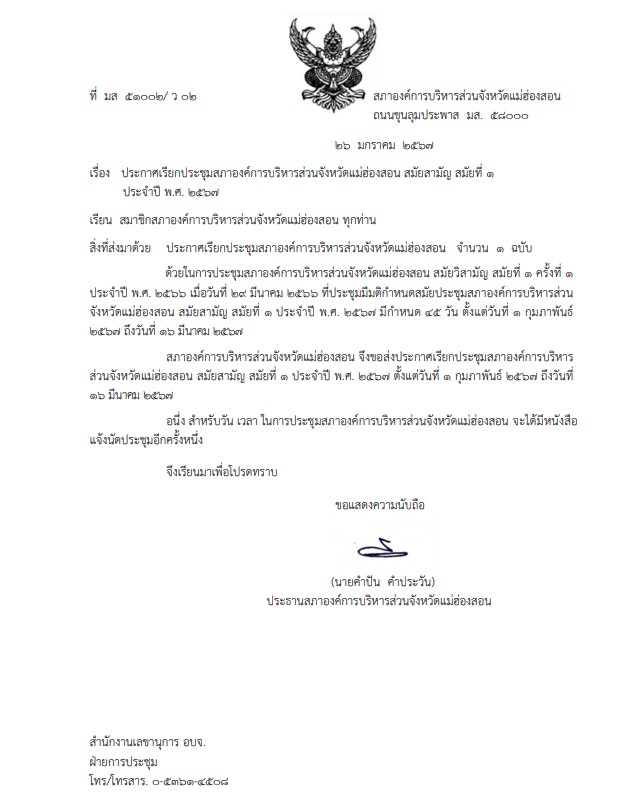 ประกาศเรียกประชุมสภาองค์การบริหารส่วนนจังหวัดแม่ฮ่องสอน สมัยสามัย สมัยที่ 1 ประจำปี พ.ศ. 2567