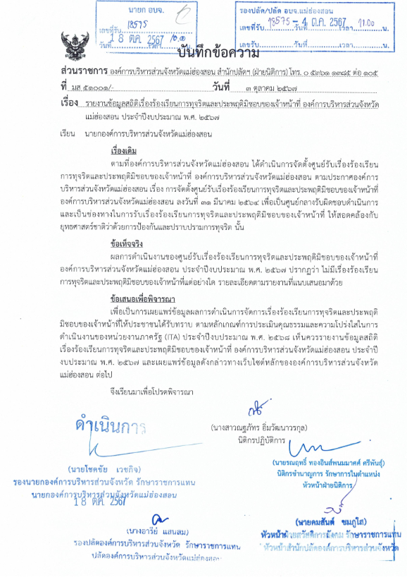 รายงานข้อมูลสถิติเรื่องร้องเรียนการทุจริตและประพฤติมิชอบของเจ้าหน้าที่องค์การบริหารส่วนจังหวัดแม่ฮ่องสอน ประจำปีงบประมาณ พ.ศ. 2567