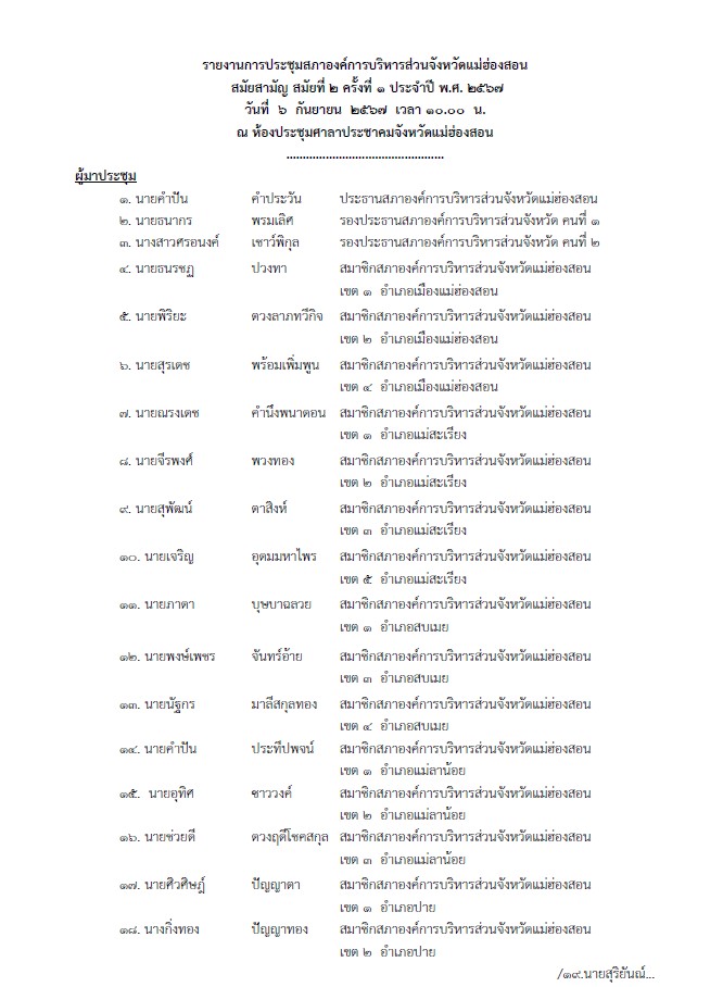 รายงานการประชุม สภาองค์การบริหารส่วนจังหวัดแม่ฮ่องสอน สมัยสามัญ สมัยที่ 2 ครั้งที่ 1 ประจำปี พ.ศ. 2567