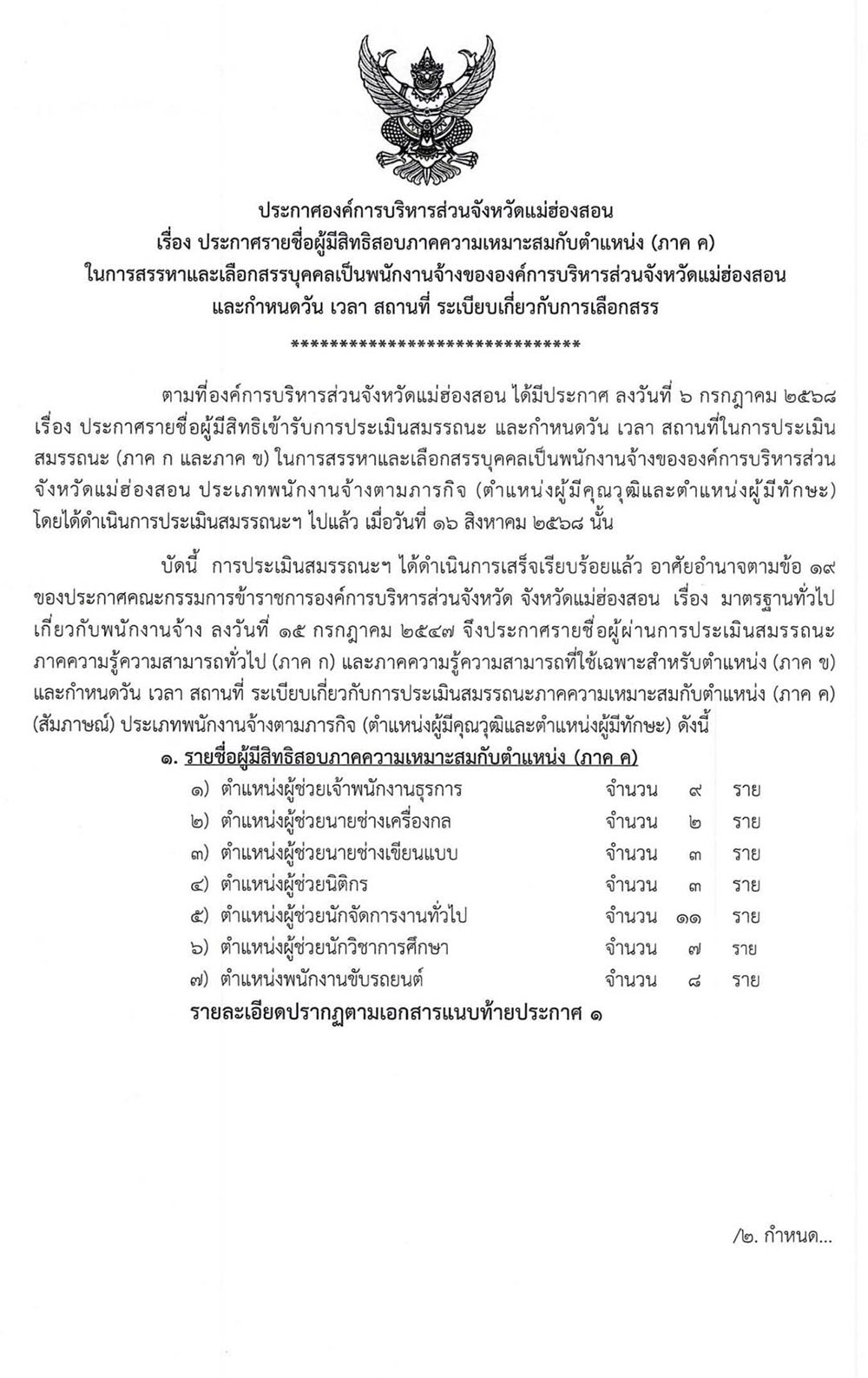 ประกาศรายชื่อผู้มีสิทธิสอบ ภาคความเหมาะสนมกับตำแหน่ง (ภาค ค) ในการสรรหาและเลือกสรรบุคคล เป็นพนักงานจ้างขององค์การบริหารส่วนจังหวัดแม่ฮ่องสอน และกำหนดวัน เวลา สถานที่ ระเบียบเกี่ยวกับการเลือกสรร ประเมินสมรรถนะฯ วันพฤหัสบดีที่ 4 กันยายน 2568 ณ ห้องประชุมส่วยทะมิน ชั้น 2 อบจ.แม่ฮ่องสอน ดูรายชื่อ เวลา และระเบียบเกี่ยวกับการเลือกสรรได้ด้านล่างนี้