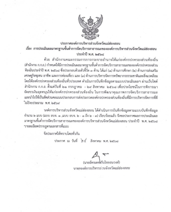 ประกาศองค์การบริหารส่วนจังหวัดแม่ฮ่องสอน เรื่อง การประเมินผลมาตรฐานขั้นต่ำการจัดบริการสาธารณะขององค์การบริหารส่วนจังหวัดแม่ฮ่องสอน ประจำปี 2568