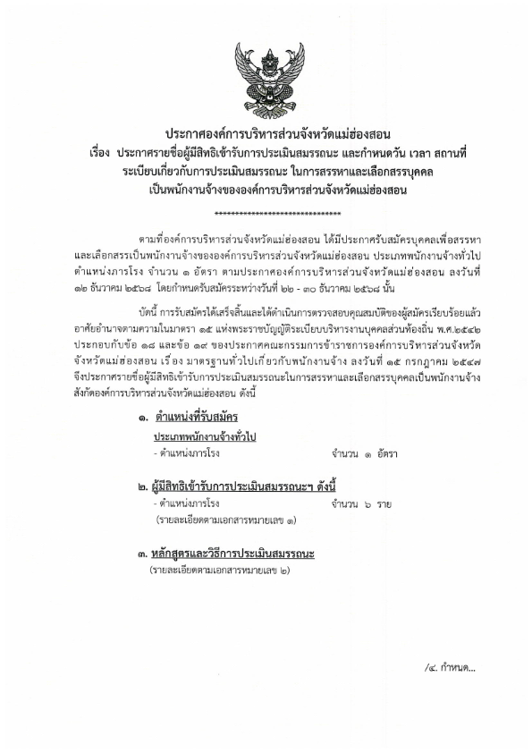 ประกาศรายชื่อผู้มีสิทธิเข้ารับการประเมินสมรรถนะเป็นพนักงานจ้าง ตำแหน่ง ภารโรง